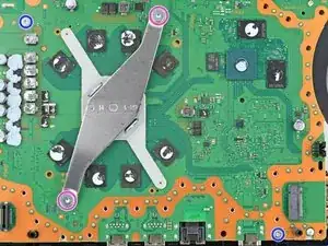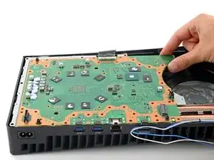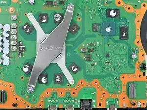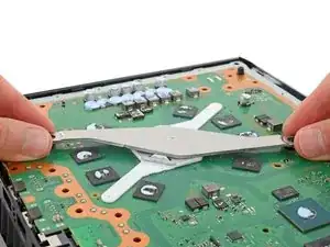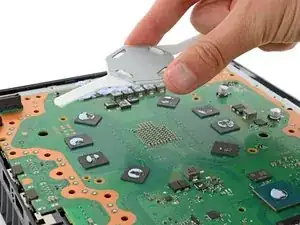 Многие мелкие тепловые прокладки склеивают основную плату с металлической экранной пластиной под ней. В зависимости от возраста вашей PlayStation и состояния прокладок может потребоваться значительная сила для отделения платы.