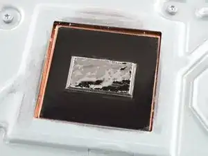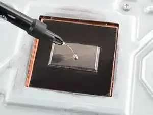 Нанесите небольшую каплю жидкого металла на радиатор (не на APU) — примерно размером с головку спички.