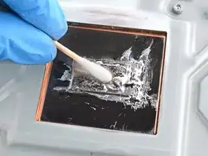 Начните с радиатора: нанесите несколько капель высококонцентрированного (более 90%) изопропилового спирта на ватную палочку и аккуратно удалите весь жидкий металл с поверхности радиатора.