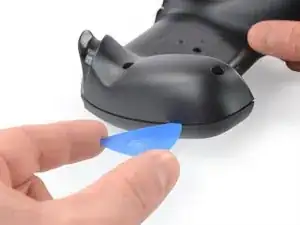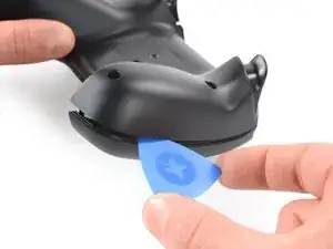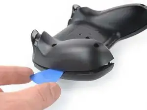 Вставьте медиатор или пластиковую лопатку в зазор между передней и задней частями корпуса у внешней стороны правой ручки контроллера.