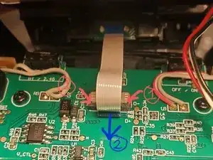 Белая лента — это шлейф данных. Чтобы отсоединить, используйте пинцет: (1) сдвиньте чёрную защёлку по обеим сторонам, затем (2) потяните синюю часть.
