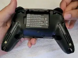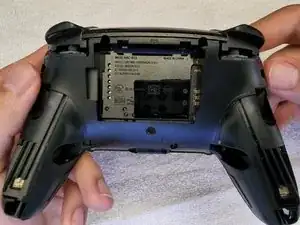 Держите контроллер, как показано на третьей картинке, положив большие пальцы на верхнюю часть контроллера. С помощью больших пальцев отожмите заднюю крышку от остальной части корпуса.