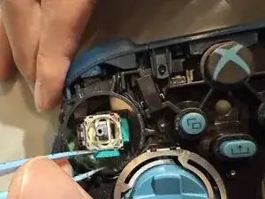 Положите контроллер лицевой стороной вверх и с помощью пинцета аккуратно отогните защёлки корпуса датчика, двигаясь в сторону от датчика аналогового стика.