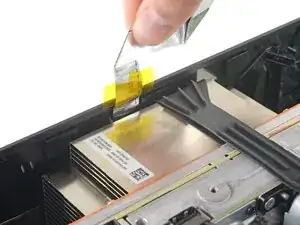 Возьмитесь тупыми пинцетами за края разъёма питания оптического привода и потяните вверх, чтобы отключить его от привода.