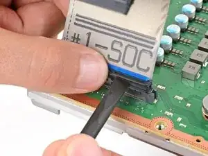 При сборке вставьте сторону разъёма соединительного кабеля #1—SOC в разъём так, чтобы фиксирующая защёлка была направлена наружу. Затем нажмите на края разъёма, пока он не зафиксируется с щелчком.