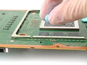 Поместите термопасту туда, где была повреждённая термопрокладка, убедитесь, что она находится точно над компонентом — в данном случае над чипом памяти.