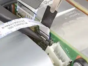 Удерживая защёлку нажатой, пинцетом потяните за язычок, чтобы отсоединить кабель кнопки питания от центрального шасси.