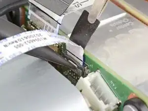 Используйте плоский конец лопатки, чтобы открыть металлическую фиксирующую защёлку на разъёме ленточного кабеля USB-порта.