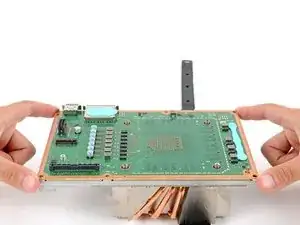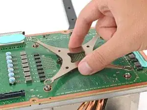 В зависимости от состояния термопасты и термоуплотнителя, плата может быть приклеена к радиатору. Если плата не снимается легко, аккуратно подденьте края платы лопаткой, чтобы отделить их.