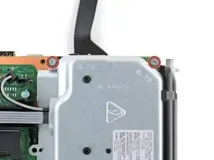 Используйте биту T8 Torx, чтобы выкрутить два винта длиной 8,8 мм, крепящих виброизолятор оптического привода к корпусу: один на основании и один на верхней части изолятора.