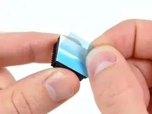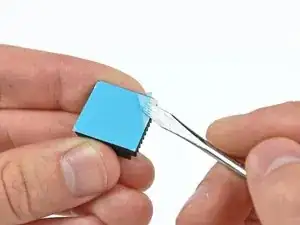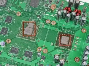 Приклейте два радиатора к верхней части двух микросхем, выделенных красным на первом изображении, следя за тем, чтобы ребра были выровнены, как показано на втором изображении.