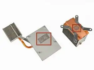 Теперь, когда радиаторы сняты с обоих процессоров, используйте пластиковую лопатку, чтобы удалить все остатки старой термопасты с поверхностей обоих процессоров и внутренних поверхностей радиаторов.