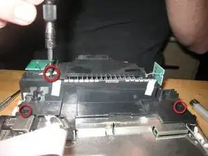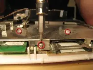 Мы приподняли крышку оптического привода, удалив шесть винтов Phillips #00. Они помечены на предыдущем изображении.