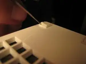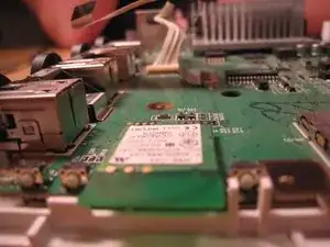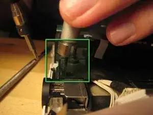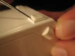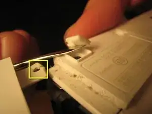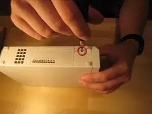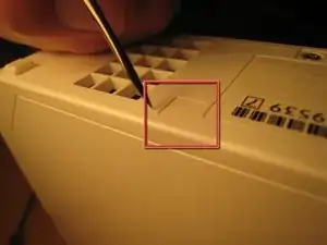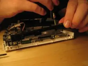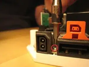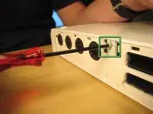 Удалите эти три чёрных винта корпуса. Правый винт на несколько миллиметров длиннее. Эти винты удерживают чёрную пластиковую крышку для портов GameCube.