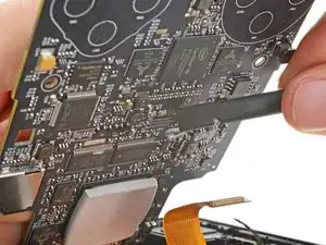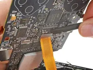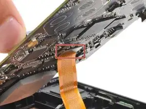 Используйте наконечник лопатки или чистый ноготь, чтобы поднять запорную планку с шарниром на ZIF‑разъёме кабеля платы, расположенном на самой плате.