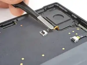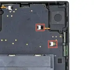 Повторите процедуру для отключения кабелей левого динамика и кнопки питания/регулировки громкости от их ZIF‑разъёмов.