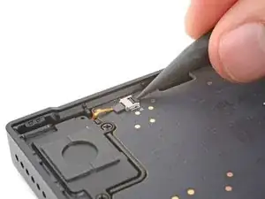 Используйте пинцет с притуплёнными губками, чтобы вытянуть разъём питания батареи из гнезда в правом нижнем углу устройства.