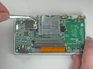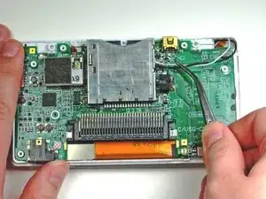 Используя металлический пинцет, осторожно отсоедините провода, потянув их от платы и под слот для карт.