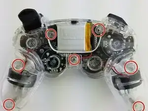 Положите контроллер лицом вниз на ровную поверхность и открутите семь винтов Phillips #0 длиной 9 мм на задней стороне контроллера.