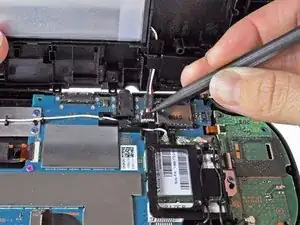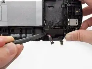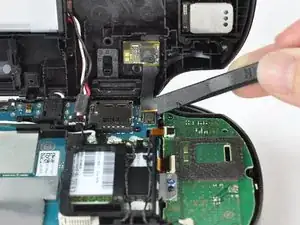 С помощью лопатки освободите гибкий кабель контроллера сенсорного экрана, аккуратно поддев соединение вверх.