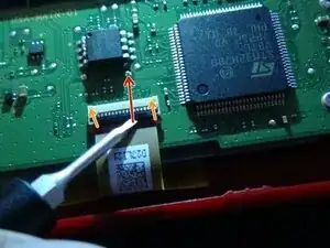 С помощью небольшой плоской отвёртки или лопатки подденьте чёрную планку на широком шлейфе и приподнимите её.