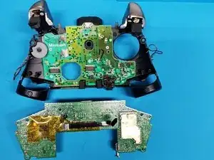 Отпаять обе пары проводов двигателей вибрации и проводов триггеров от обратной стороны дочерней платы.