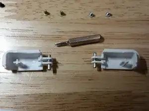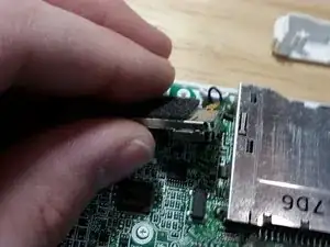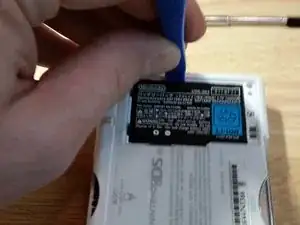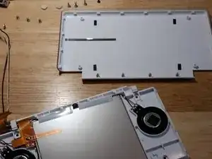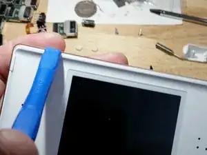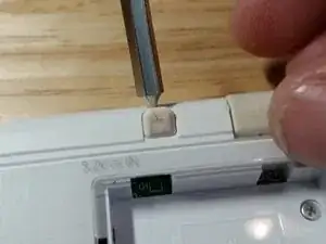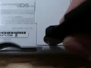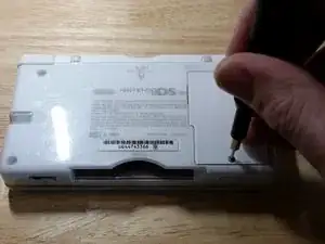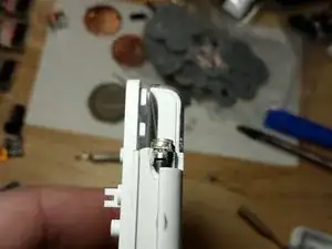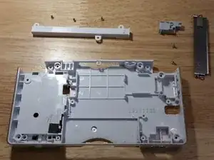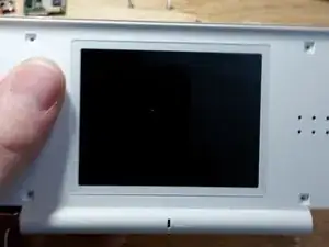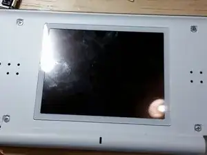 Пластиковая крышка зажата под задним металлическим экраном и удерживается несколькими способами в зависимости от возраста DS Lite. Один из методов — по две защёлки с каждой стороны. Аккуратно отожмите защёлки, не снимая задний металлический экран. Этот шаг не нужен, если вы не меняете цвет корпуса.