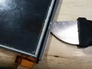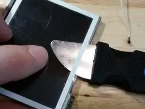 Сдвиньте металлическую лопаточку под чёрную наклейку и аккуратно обойдите вокруг узла, избегая гибких кабелей. Этот шаг проще, чем кажется, но выполняйте его только если требуется заменить экран или сенсорную панель. Если оба работают, этот шаг не нужен. Тщательно очистите обе детали спиртом после.