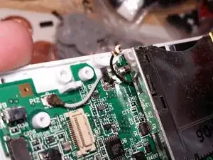 Снимите этот чёрный провод. Придётся покачивать его, чтобы вынуть. Одна из самых неудачных конструктивных решений в DS Lite — помимо проблемы с фиксатором — этот чёрный провод ещё сложнее вставлять обратно. Не пытайтесь каким-либо образом вмешиваться в разъём картриджа DS. С настойчивостью чёрный провод выйдет, и при сборке он вернётся на место.
