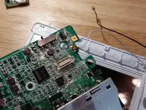Переверните материнскую плату, как показано. Будьте осторожны — шлейф хрупкий. Обратите внимание на китайские надписи на консоли, сделанной на заводе Nintendo.