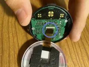 С помощью лопаточки или ногтя осторожно поднимите защёлку, освободив ленточный кабель (показано на изображении 2).