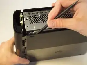 Вставьте лопатку в щель между правой перфорированной стороной и верхней частью корпуса Xbox. Проще начинать вдали от вентиляционной решётки.