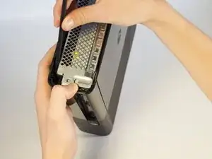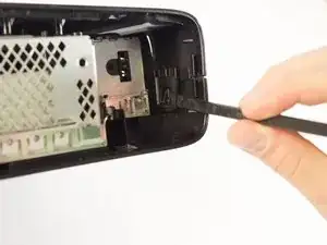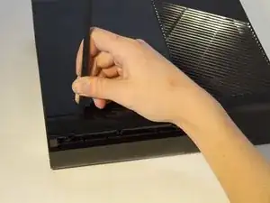 Поверните Xbox влево, чтобы найти защёлку, крепящую переднюю панель к корпусу. Вставьте лопатку в зазор, чтобы освободить защёлку. Может потребоваться пошевелить лопатку. Защёлка отщёлкнется, сделав переднюю панель менее тугой.