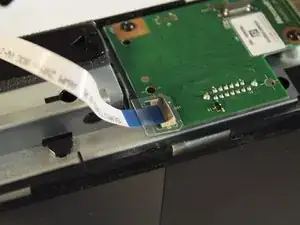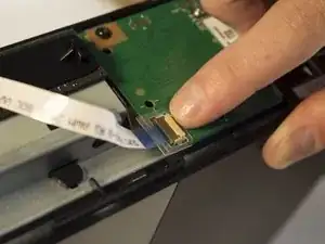 Найдите коричневую часть, где ленточный кабель входит в зелёную плату. Поднимите коричневую защёлку вверх и вытяните пластиковую вкладку на конце ленты.