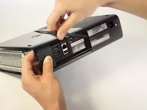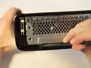 Осторожно переверните устройство и снимите корпус, поддев его за металлическую часть, прикреплённую к пластиковому наружному панелю.