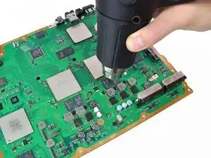 Двигательными круговыми движениями равномерно нагревайте (на низкой температуре) два процессора, помеченные «RSX» и «CELL», в течение 2 минут, удерживая пистолет приблизительно на 1/2" (12 мм) над чипом. Для двух нижних областей нагревайте 30 секунд, соблюдая те же рекомендации по расстоянию.