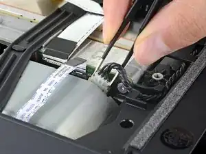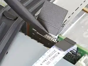 Используйте пинцет, чтобы потянуть вверх чёрную пластиковую язычок и отсоединить кабель порта USB.