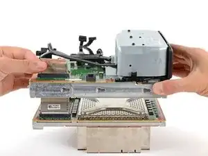 Захватите центральный каркас и потяните его к зелёной решётке вентилятора в верхней части корпуса, выведя направляющие штифты из корпуса.