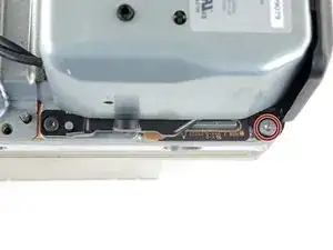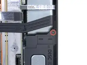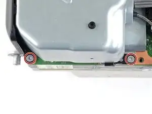 Отвёрткой T8 Torx открутите два винта длиной 8,8 мм, крепящих демпфер вибрации оптического привода к корпусу: один на основании и один на верхней части демпфера.