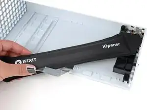Нагрейте iOpener и приложите его к меньшей наклейке у нижней части задней панели на две минуты.