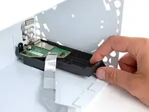 Пинцетом аккуратно потяните вверх за чёрную пластиковую тягу, чтобы отключить кабель USB‑порта.