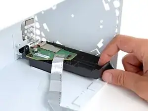 Удерживая металлическую защёлку нажатой, используйте пинцет, чтобы потянуть вверх за тягу и отсоединить кабель кнопки питания от центрального шасси.