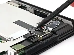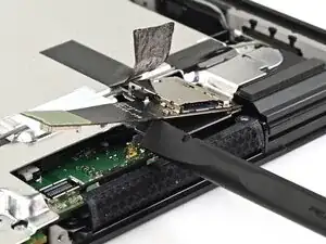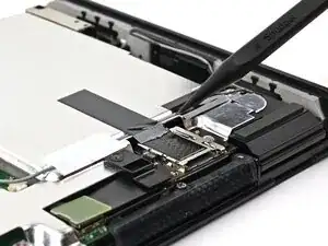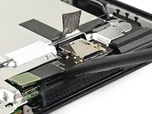 Вставьте острый конец лопатки под черную ленту, закрепляющую считыватель карты MicroSD.