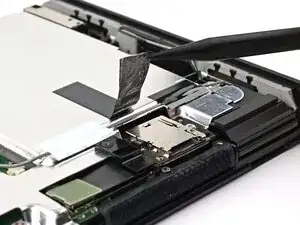 Используйте отвертку JIS 00, чтобы вывернуть черный винт длиной 1.6 мм, крепящий скобу над кабелем считывателя MicroSD.