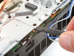 Используйте острие лопатки, чтобы нажать на металлический фиксатор межсоединительного кабеля вниз и в сторону от разъёма, чтобы разблокировать его.
