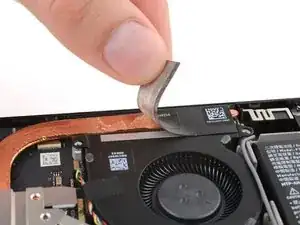 Используйте iOpener или фен, чтобы размягчить клей на чёрной наклейке, соединяющей радиатор с вентилятором.