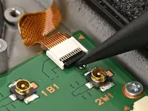 Используйте наконечник лопатки, чтобы поднять фиксирующий флип на кабеле платы кнопок разъема ZIF, расположенном рядом с батареей на плате консоли.