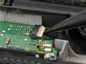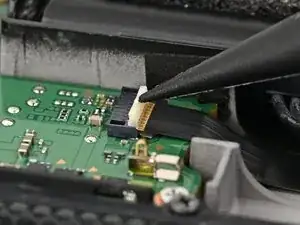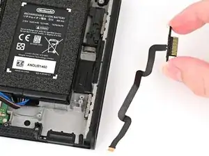 Используйте конец лопатки, чтобы поднять фиксирующую защелку на кабеле разъема Joy-Con 2 слева ZIF разъем, который находится под батареей на плате консоли.
