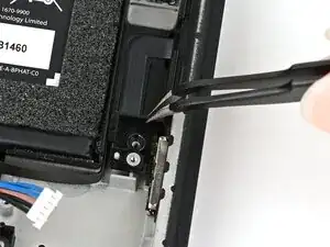 Используйте отвертку JIS 00, чтобы удалить черный винт длиной 2.3 мм, фиксирующий кронштейн кабеля разъема Joy-Con 2 слева.