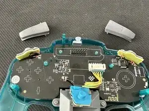 Аккуратно снимите ленты, удерживающие контакты кнопок L, R и Z на месте. Проводка выглядит хрупкой — действуйте с осторожностью
